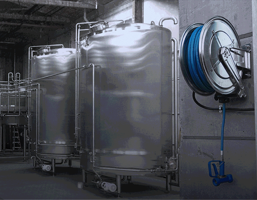 Stainless steel and UPVC reels to maintain sanitation and help with cleaning in breweries and food production